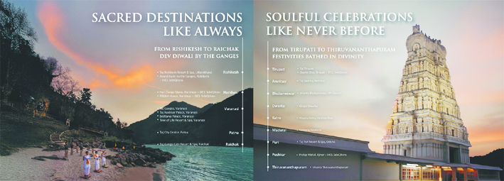 IHCL के होटल ऐसे अनुभाविक टूर प्रस्तुत करते हैं, जो देश की जीवंत विरासत के दर्शन कराते हैं। इनमें ऐसी परम्पराएं शामिल हैं जो एक पीढ़ी से दूसरी पीढ़ी तक चली आ रही हैं, जिनसे समुदायों में निरंतरता का ऐहसास होता है। पर्यटक राजस्थान के बिश्नोई गांव की खास आदिवासी जिंदगी, कर्नाटक के शानदार अतीत और मैसूर दशहरा के जरिए त्योहारों का अनुभव कर सकते हैं, या उदयपुर में मोलेला टेराकोटा आर्ट द्वारा टेराकोटा में हाथ से रची गई कथाओं को देख सकते हैं। बगरु हैंड ब्लॉक प्रिंटिंग के जरिए पैटर्न और टेक्सटाइल की प्रेम कहानी और जयपुर में ब्लू पॉटरी के जरिए जीवित रखी गई तुर्की-फारसी परम्परा, कोलकाता में देवी शक्ति का उत्सव-दुर्गा पूजा, वाराणसी में गंगा आरती के साथ-साथ कोलकाता में एक ऐतिहासिक नदी किनारे की जगह, छोटेलाल की घाट के संरक्षण और मरम्मत का अनुभव कर सकते हैं। आईएचसीएल पथ्य के तहत अपने ईसीजी प्लस फ्रेमवर्क के जरिए भारत की सांस्कृतिक विरासत को बचाने और बढ़ावा देने के लिए समर्पित है।