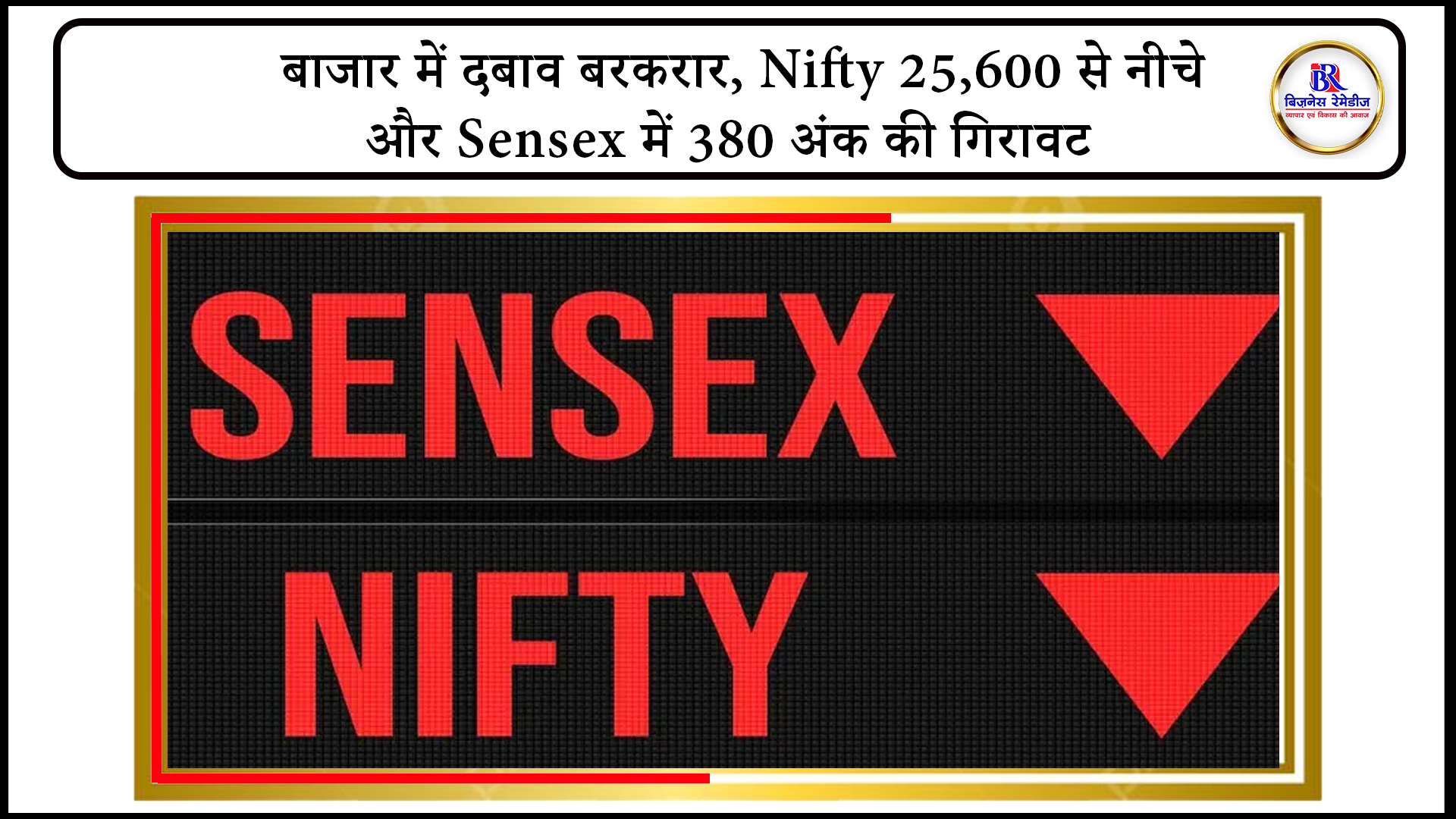 आज Stock Market में दबाव का माहौल बना रहा। कारोबारी सत्र के दौरान Nifty 25,600 के अहम स्तर से नीचे ट्रेड करता नजर आया, जबकि Sensex में करीब 380 अंक की गिरावट दर्ज की गई। कमजोर वैश्विक संकेत, ऊंचे वैल्यूएशन और निवेशकों की सतर्कता के कारण बाजार में बिकवाली हावी रही। शुरुआती बढ़त के बाद बाजार ने धीरे-धीरे निचले स्तरों की ओर रुख किया।