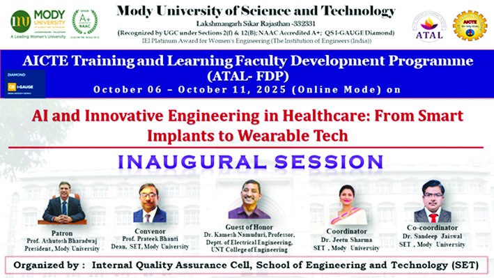 बिजऩेस रेमेडीज/लक्ष्मणगढ Mody University of Science and Technology  LaxmanGarh में सोमवार को एआईसीटीई-अटल द्वारा प्रायोजित छह दिवसीय फैकल्टी डेवलपमेंट प्रोग्राम (FDP) ‘एआई एंड इनोवेटिव इंजीनियरिंग इन हेल्थकेयर फ्रॉम स्मार्ट इम्प्लांट्स टू वेयरेबल टेक’ का शुभारंभ हुआ। यह कार्यक्रम 11 अक्टूबर तक चलेगा, जिसमें देश-विदेश के 150 से अधिक शिक्षाविद, शोधकर्ता और विशेषज्ञ भाग ले रहे हैं।