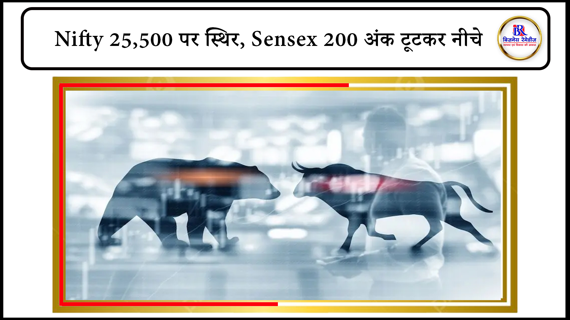 आज Stock Market में mixed trend देखने को मिला, जहां Nifty 25,500 के level पर trade कर रहा है और Sensex करीब 200 pts से slip कर गया। Investors cautious mood में नजर आए और trading session के दौरान अस्थिरता बनी रही। Global cues कमजोर रहने के कारण Domestic market पर pressure बना रहा, जबकि selective stocks में buying support दिखा।