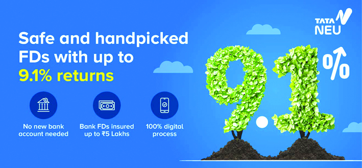 टाटा डिजिटल ने Tata Neu पर अपने Fixed Deposit मार्केटप्लेस के लॉन्च के साथ खुदरा निवेश क्षेत्र में अपने विस्तार की घोषणा की। यह नवोन्मेषी प्लेटफॉर्म अपने ग्राहकों को बचत बैंक खाते की आवश्यकता के बगैर, 9.1 प्रतिशत तक की ब्याज दरों पर अग्रणी वित्तीय संस्थानों के साथ फिक्स्ड डिपॉजिट में निवेश करने का अधिकार देता है।